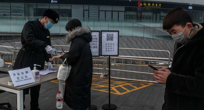 Một chốt kiểm tra phòng dịch bên ngoài một tòa nhà văn phòng ở Beijing (Trung Quốc). (Ảnh: Gilles Sabrie for The New York Times/ Internet. Thanks.)