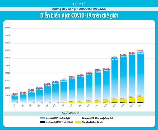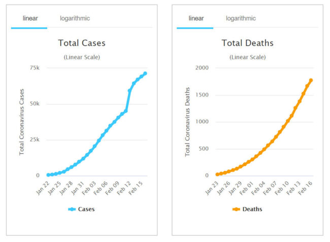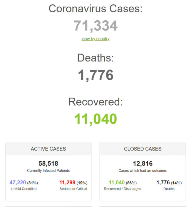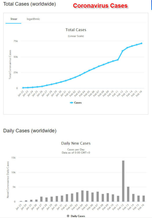 + Theo số liệu của trang Worldometer ngày 17-2-2020, cả thế giới đã có 71.334 người nhiễm virus (tăng từ 69.269 người sáng qua), trong đó có 11.298 người (giảm so với 11.299 người hôm qua) trong tình trạng nguy kịch, chiếm 19% trong tổng số đang nhiễm. Riêng ở đại lục Trung Quốc có 70.550 người nhiễm (tăng từ 68.501 người sáng qua). Có 1.776 người tử vong (tăng từ 1.669 người hồi sáng qua), trong đó 1.771 người ở đại lục Trung Quốc (tăng so với 1.665 người hồi sáng qua) và 5 người ở Philippines, Hong Kong, Nhật Bản, Pháp và Taiwan. Có 106 người chết trong ngày 16-2 (tăng so với 143 người ngày hôm trước). Số người được chữa khỏi COVID-19 hiện là 11.040 người (tăng từ 9.571 người vào sáng qua). Trừ đi số đã xác định (outcome) bao gồm tử vong, khỏi bệnh và xuất viện (tổng cộng 12.816 người), số người hiện đang nhiễm là 58.518 người (tăng từ 58.029 người sáng qua).