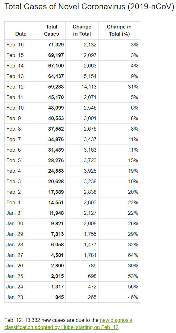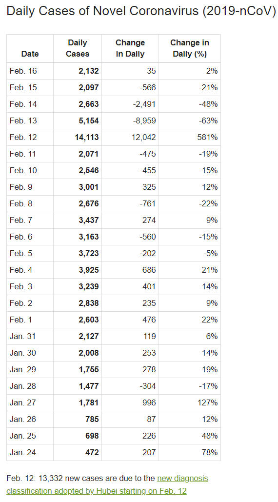- Sau cú tăng đột biến như pháo thăng thiên ngày 12-2 do Trung Quốc áp dụng chỉ tiêu thống kê chẩn đoán mới, rộng hơn, số người nhiễm mới tiếp tục giảm dần từng ngày. Ngày 13-2 có mức tăng 9%, ngày 14-2 tăng 4%, ngày 15-2 tăng 3%, và ngày 16-2 tăng 3%).
