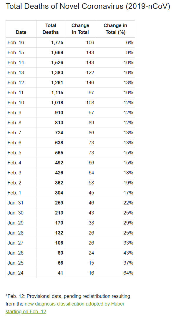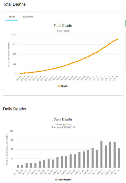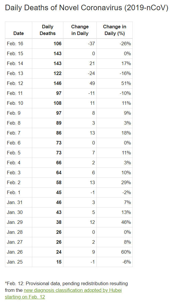 - Ngày 16-2-2020, số người tử vong vì virus nCoV COVID-19 thêm một ngày nữa tăng ở 3 chữ số (106 người, so với 143 người vào ngày 15-2, 143 người vào ngày 14-2, 122 người vào ngày 13-2 và 146 người của ngày 12-2). Tốc độ tăng của số tử vong đang tiếp tục giảm: ngày 12-2 tăng 13%, ngày 13-2 tăng 10%, ngày 14-2 tăng 10%, ngày 15-2 tăng 9%, và ngày 16-2 tăng 6%).