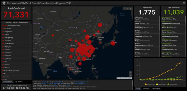 + Trang thông tin cập nhật về dịch Coronavirus COVID-19 Global Cases Johns Hopkins CESE của trường Đại học Y Johns Hopkins, một trường có tiếng ở Mỹ, tính tới sáng 17-2-2020 (theo giờ VN), ghi nhận: có 71.331 trường hợp nhiễm virus được xác nhận trên thế giới (so với 69.186 trường hợp ngày hôm qua), trong đó có 70.550 ca ở đại lục Trung Quốc (so với 68.500 ca ngày hôm qua). Có 1.775 người tử vong (so với 1.669 người hồi sáng qua), gồm 1.770 người ở đại lục Trung Quốc, 1 người Trung Quốc ở Philippines, 1 người Hong Kong chết ở Hong Kong, 1 người Nhật ở Nhật Bản, 1 du khách Trung Quốc ở Pháp, và 1 người Taiwan ở Taiwan. Và có 11.039 người bệnh đã được điều trị hồi phục (so với 9.554 người ngày hôm qua), trong đó có 6.642 người ở tỉnh Hubei tâm dịch. Trang này ghi nhận có 7 ca được chữa khỏi ở Việt Nam.