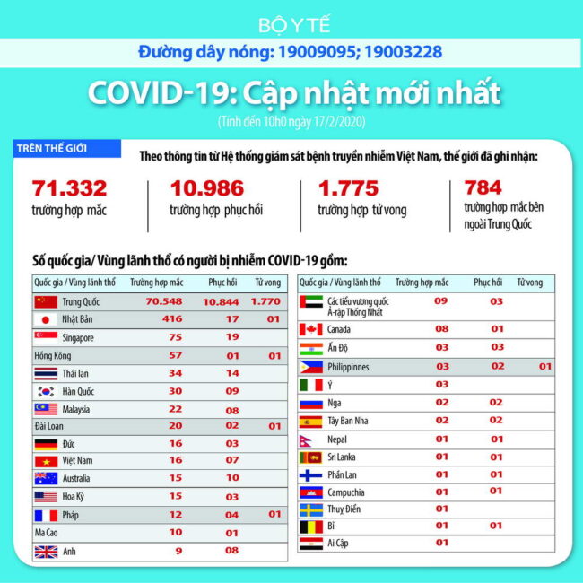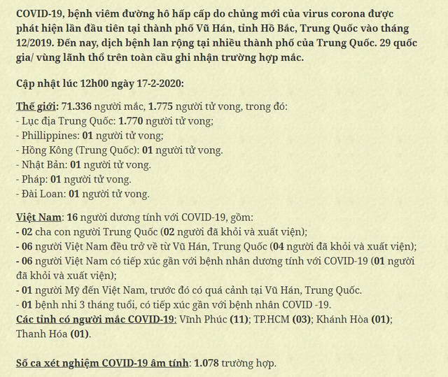 + Số liệu của Bộ Y tế Việt Nam cập nhật lúc 12g00 ngày 17-2-2020 cho biết cả thế giới có 71.336 người nhiễm virus nCoV COVID-19 (so với 69.269 người vào ngày hôm qua). Có 1.775 người chết, trong đó 1.770 người ở đại lục Trung Quốc, 1 người ở Philippines, 1 người ở Hong Kong, 1 người ở Nhật Bản, 1 người ở Pháp, và 1 người ở Taiwan. Như vậy đến ngày 17-2-2020 có 5 trường hợp tử vong vì virus nCoV COVID-19 bên ngoài đại lục Trung Quốc.