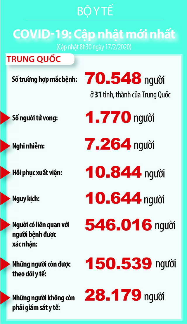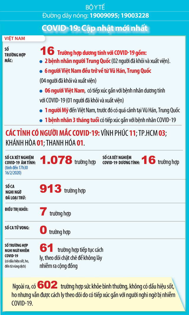 - Tới hết ngày 16-2-2020, có 11.040 người nhiễm nCoV COVID-19 đã được chữa khỏi (chiếm 15,47% so với tổng người nhiễm; tỷ lệ này là 13,81% hồi sáng qua). Việt Nam đã chữa khỏi và cho xuất viện 7 người trong tổng số 16 ca nhiễm.