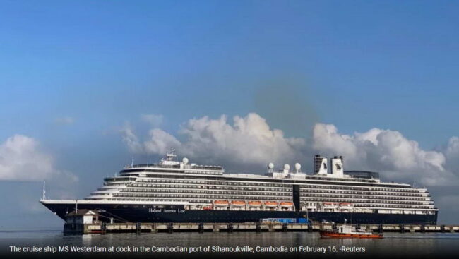 – Báo Malaysia New Straits Times (16-2-2020) dẫn tin của hãng tin Mỹ Bloomberg cho biết 20 du khách trên tàu MS Westerdam ngày 14-2 được phía Cambodia xét nghiệm dựa theo tự báo cáo có những triệu chứng như ho và rối loạn tiêu hóa, và tất cả đều có kết quả âm tính với virus gây dịch COVID-19. Trong khi đó, Li Ailan, đại diện WHO ở Cambodia, cho biết WHO đã cung cấ[ hướng dẫn cho Bộ Y tế Cambodia để giúp giải quyết việc giải tỏa số hành khách trên du thuyến này. Ông này nói trước khi có tin Malaysia phát hiện có 1 ca nhiễm virus từ số hành khách trên tàu MS Westerdam, vừa bay tới Kuala Lumpur rằng: “Các hành khách này đã ở trên tàu hầu như suốt 14 ngày – xong thời gian cách ly 2 tuần theo quy định.” Vì thế, có lẽ dựa trên báo cáo khi cập cảng Sihanoukville ngày 14-2, không có ai trên tàu có triệu chứng nhiễm virus nCoV nên việc cho hành khách lên bờ diễn ra dễ dàng hơn.