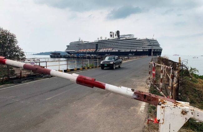 Du thuyền MS Westerdam đang đậu tại cảng Sihanoukville (Cambodia) sáng 17-2-2020. (Ảnh: Clare Baldwin/Reuters/ NYT/ Internet. Thanks.)
