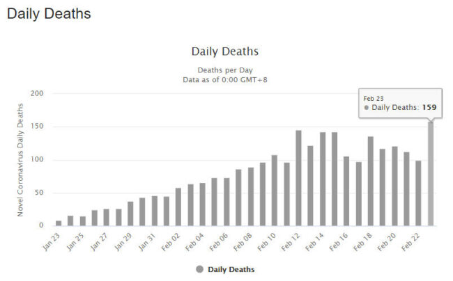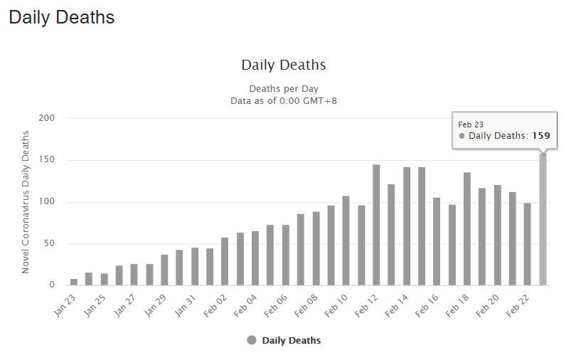 Ngày 23-2 là ngày có số lượng người tử vong cao nhất (159 người) kể từ khi phát hiện ca tử vong đầu tiên ngày 9-1-2020. Ngày 23-2 có 159 người chết, ngày 22-2 có 100 người chết, ngày 21-2 có 113 người chết, ngày 20-2 có 121 người chết, ngày 19-2 có 117 người chết, ngày 18-2 có 136 người chết, ngày 17-2 có 98 người chết, ngày 16-2 có 106 người chết, ngày 15-2 có 143 người chết, ngày 14-2 có 143 người chết, ngày 13-2 có 122 người chết, ngày 11-2 có 97 người chết, ngày 10-2 có 108 người chết, ngày 9-2 có 97 người chết, ngày 8-2 có 89 người chết, ngày 7-2 có 86 người chết, hai ngày 6 và 5-2 có 73 người chết /ngày, ngày 4-2 có 66 người, ngày 3-2 có 64 người chết, ngày 2-2 có 58 người chết, ngày 1-2 có 45 người chết và ngày 31-1 có 46 người chết. Tỷ lệ người tử vong so với số nhiễm vẫn tiếp tục tăng, dù nhẹ (sáng 24-2-2020 là 3,28%).