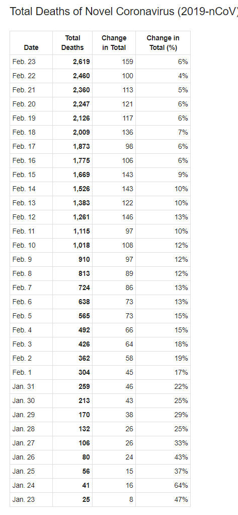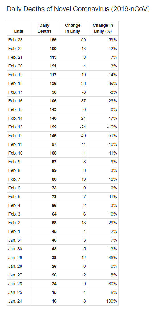 • Ngày 23-2-2020, số người tử vong vì virus nCoV COVID-19 tiếp tục tăng với 3 chữ số (cập nhật lúc 10 giờ, trong khi báo cáo lúc 8g đột ngột giảm mạnh chỉ còn 9 hay 11 người), có 158 người chết (so với 100 người chết ngày 22-2, 113 người chết của ngày 21-2, 121 người chết của ngày 20-1, 117 người của ngày 19-2, 136 người của ngày 18-2, 98 người của ngày 17-2, 106 người vào ngày 16-2, 143 người vào ngày 15-2, 143 người vào ngày 14-2, 122 người vào ngày 13-2 và 146 người của ngày 12-2). Tốc độ tăng của số tử vong đang tiếp tục giảm: ngày 12-2 tăng 13%, ngày 13-2 tăng 10%, ngày 14-2 tăng 10%, ngày 15-2 tăng 9%, ngày 16-2 tăng 6%, ngày 17-2 tăng 6%, ngày 18-2 tăng 7%, ngày 19-2 tăng 6%, ngày 20-2 tăng 6%, ngày 21-2 tăng 5%, ngày 22-2 tăng 4%, và ngày 23-2 tăng 6%).