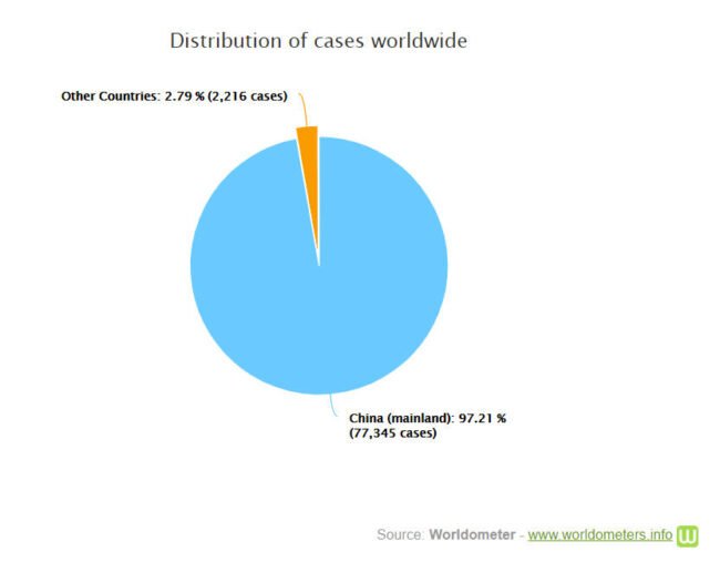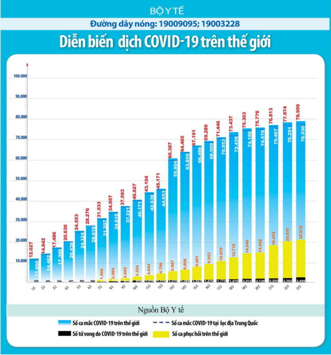 + Theo số liệu của trang Worldometer ngày 24-2-2020, cả thế giới đã có 79.619 người nhiễm virus (tăng từ 78.773 người sáng qua), trong đó có 11.569 người (tăng so với 11.553 người hôm qua) trong tình trạng nặng hay nguy kịch, chiếm 22% trong tổng số đang nhiễm. Riêng ở đại lục Trung Quốc có 77.403 người nhiễm (tăng từ 76.936 người sáng qua). Có 2.619 người chết, thay vì 2.471 người như báo cáo lúc 8 giờ (tăng từ 2.460 người hồi sáng qua), trong đó 2.592 người ở đại lục Trung Quốc (tăng so với 2. 345 người hồi sáng qua) và 27 người ở Philippines, Hong Kong (2 người), Nhật Bản (4 người), Pháp, Taiwan, Iran (8 người), Hàn Quốc (7 người), và Ý (3 người). Có 158 người chết trong ngày 23-2, (tăng so với 100 người ngày hôm trước). Số người được chữa khỏi COVID-19 hiện là 25.023 người (tăng từ 23.193 người vào sáng qua). Trừ đi số đã xác định (outcome) bao gồm tử vong, khỏi bệnh và xuất viện (tổng cộng 27.642 người), số người hiện đang nhiễm là 51.977 người (tiếp tục giảm từ 53.118 người sáng qua).