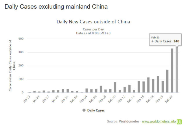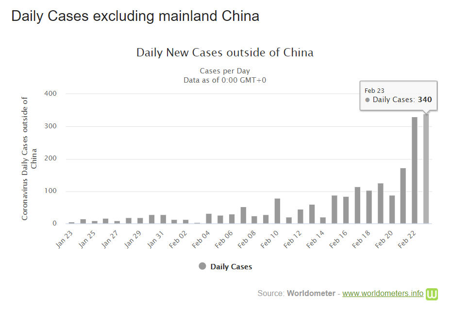 • Hàn Quốc tiếp tục tăng vọt số người nhiễm, sáng 24-2 lên tổng cộng 763 người, rải hầu khắp các tình thành. Có 6 người chết (có nguồn ghi 7 người). Iran cũng tăng nhanh lên 43 người nhiễm và 8 người chết. Ý đã vọt lên 157 người nhiễm và 3 người chết. Có thêm Iraq vào danh sách quốc gia có người nhiễm (1 người), đưa tổng số nước và vùng lãnh thổ có người nhiễm lên 33.