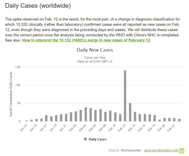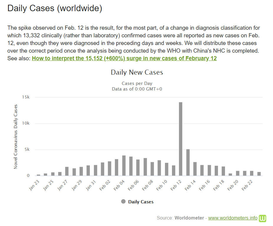 • Lúc 8g sáng 24-2-2020, các trang web thống kê cập nhật số liệu về COVID-19 rối vì có số lượng tử vong tăng quá thấp (9-11 người) so với ngày hôm trước. Tới 10g, cập nhật sửng sốt với số tử vong kỷ lục tăng 158 người (đại lục Trung Quốc tăng 150 người).