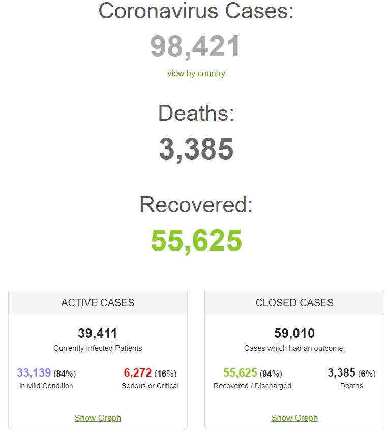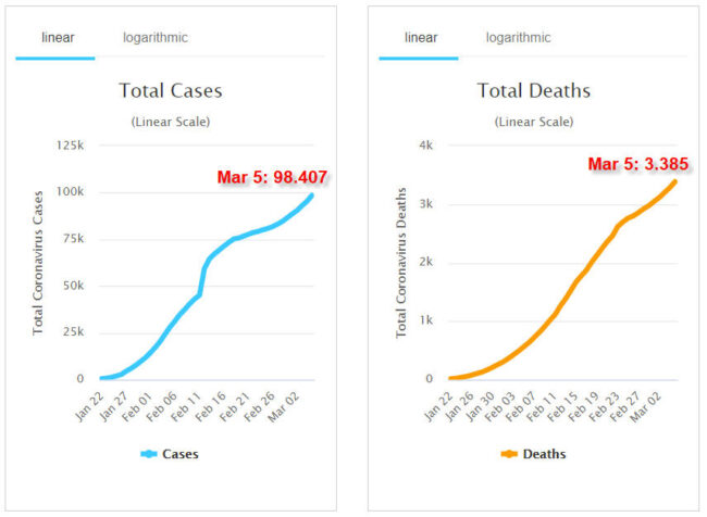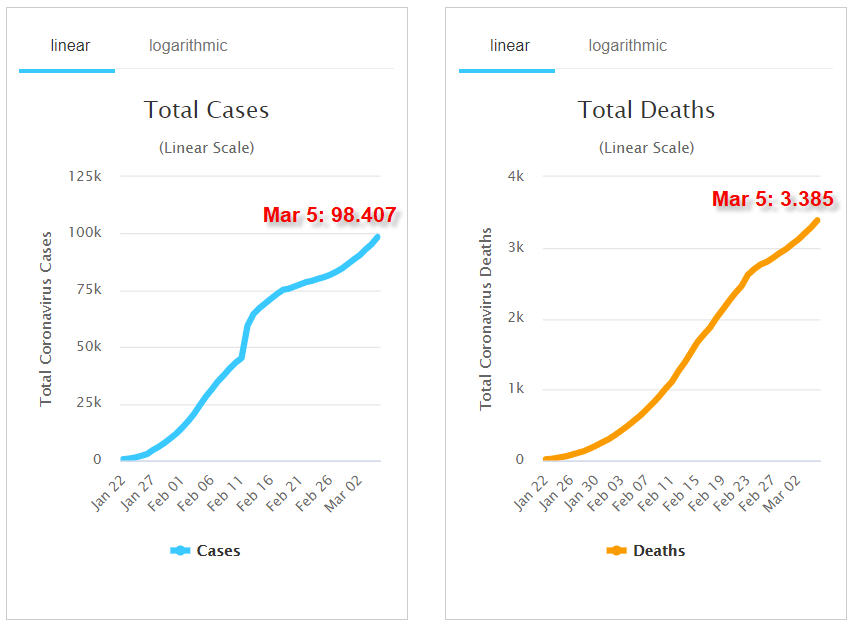 + Theo số liệu của trang Worldometer ngày 6-3-2020, cả thế giới đã có 98.421 người nhiễm virus (tăng từ 95.481 người sáng qua), trong đó có 6.272 người (giảm so với 6.420 người hôm qua) trong tình trạng nặng hay nguy kịch, chiếm 16% trong tổng số đang nhiễm. Riêng ở đại lục Trung Quốc có 80.552 người nhiễm (tăng từ 80.430 người sáng qua). Có 3.385 người chết (tăng từ 3.285 người hồi sáng qua), trong đó 3.042 người ở đại lục Trung Quốc (tăng so với 3.012 người hồi sáng qua) và 343 người ở Philippines (1), Hong Kong (2 người), Nhật Bản (12 người, trong đó có 6 người trên du thuyền quốc tế Diamond Princess cập cảng Yokohama), Pháp (7), Taiwan (1), Úc (2), Iran (108 người), Hàn Quốc (40 người), Ý (148 người), Mỹ (12), Iraq (3), Thái Lan (1), San Marino (1), Tây Ban Nha (3), Thụy Sĩ (1), Anh (1). Có 100 người chết trong ngày 5-3 (so với 83 người ngày hôm trước). Số người được chữa khỏi COVID-19 hiện là 55.625 người (tăng từ 53.688 người vào sáng qua). Trừ đi số đã xác định (outcome) bao gồm tử vong, khỏi bệnh và xuất viện (tổng cộng 56.973 người), số người hiện đang nhiễm là 38.508 người (tiếp tục giảm từ 39.008 người sáng qua).