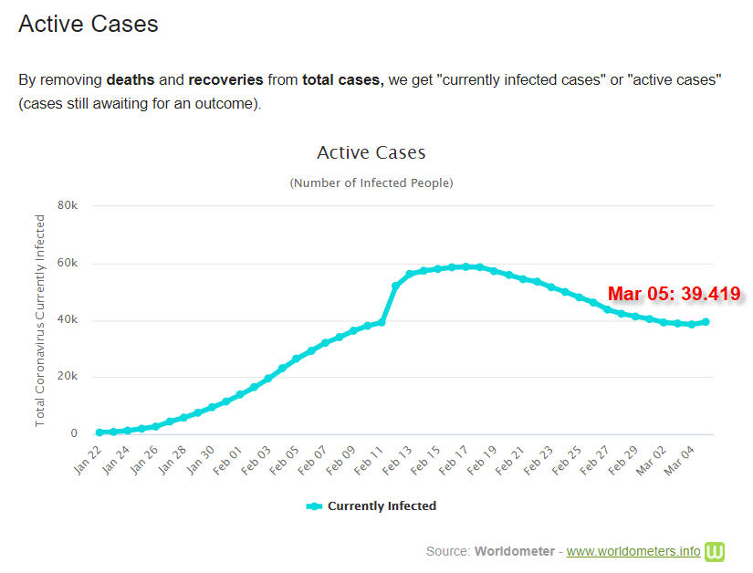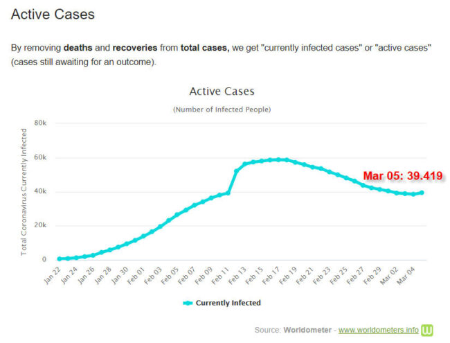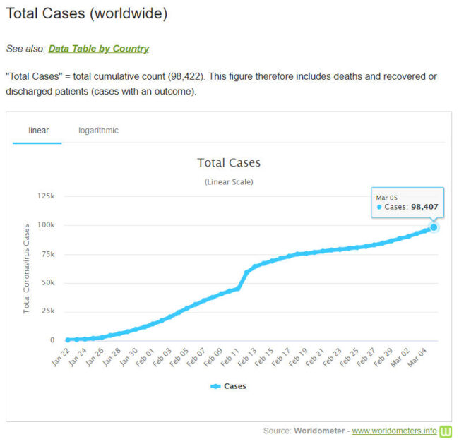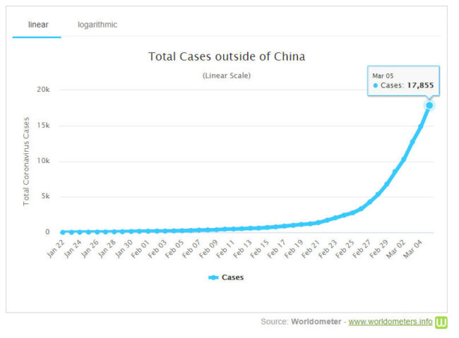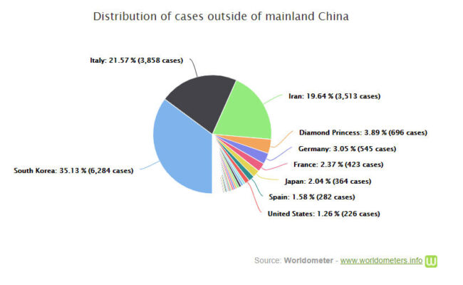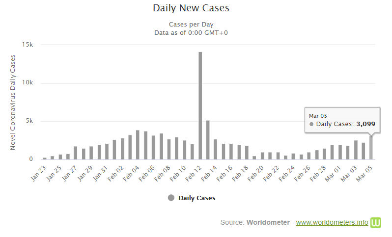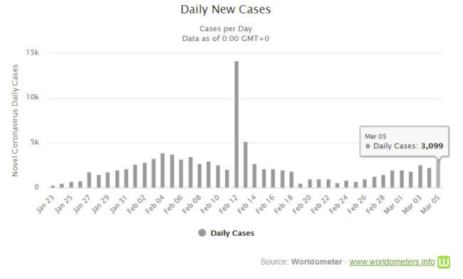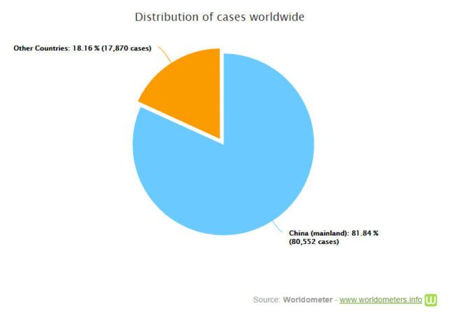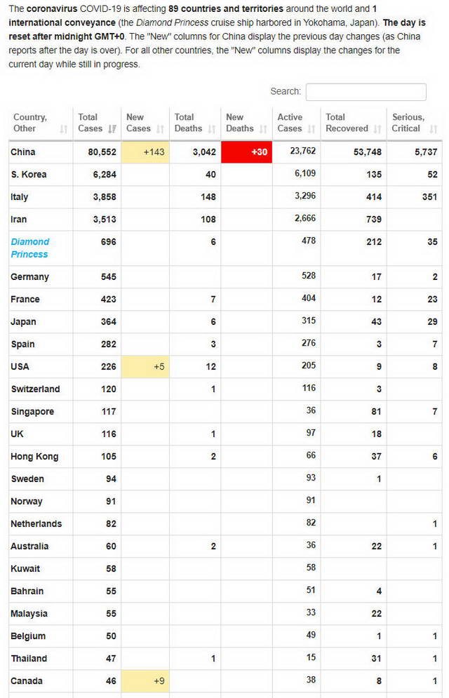 The coronavirus COVID-19 is affecting 89 countries and territories around the world and 1 international conveyance (the Diamond Princess cruise ship harbored in Yokohama, Japan). The day is reset after midnight GMT+0. The “New” columns for China display the previous day changes (as China reports after the day is over). For all other countries, the “New” columns display the changes for the current day while still in progress.