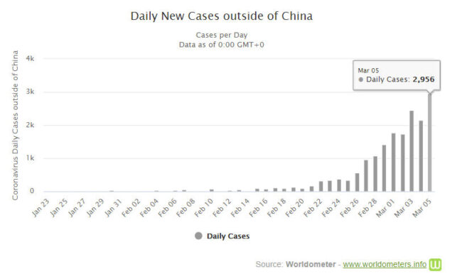 - Ở đại lục Trung Quốc, theo báo cáo, trong ngày 5-3-2020, số nhiễm mới tăng 143 người (so 160 người hôm trước) và số tử vong mới tăng 30 người (so với 31 người ngày hôm trước). Nhưng ở thế giới bên ngoài Trung Quốc, novel coronavirus đang ngày càng thêm hung hăng và lan rộng hơn. Ngày 26-2-2020, lần đầu tiên số ca nhiễm mới ở bên ngoài đại lục Trung Quốc cao hơn số ở đại lục tâm dịch (880 so với 333 người), và tiếp tục tăng cách biệt. Số tử vong mới hàng ngày ở bên ngoài đại lục Trung Quốc cũng cao hơn tại đại lục (70 so với 41 người), và có tỷ lệ tử vong cao hơn. Ở bên ngoài đại lục Trung Quốc trong ngày 5-3 có thêm 2.956 ca nhiễm mới (so với 2.154 ca ngày hôm trước) – cao nhất trước nay. Liên tiếp từ ngày 23-2-2020 mỗi ngày đều có thêm nước mới xuất hiện người nhiễm SARS-CoV-2 (tên chính thức của novel coronavirus). Ngày 23-2 thêm 1 nước, ngày 24-2 thêm 4 nước, ngày 25 và 26-2 mỗi ngày thêm 5 nước, ngày 27-2 có thêm 6 nước, ngày 28-2 thêm 6 nước, ngày 29-2 thêm 4 nước, ngày 1-3 thêm 3 nước, ngày 2-3 thêm 9 nước, ngày 3-3 có thêm 4 nước, ngày 4-3 có thêm 4 nước, và ngày 5-3 có thêm 5 nước. Hiện có 89 nước và vùng lãnh thổ có người mắc bệnh COVID-19 (so với 84 sáng qua) – thế giới có 195 quốc gia được Liên Hiệp Quốc công nhận.