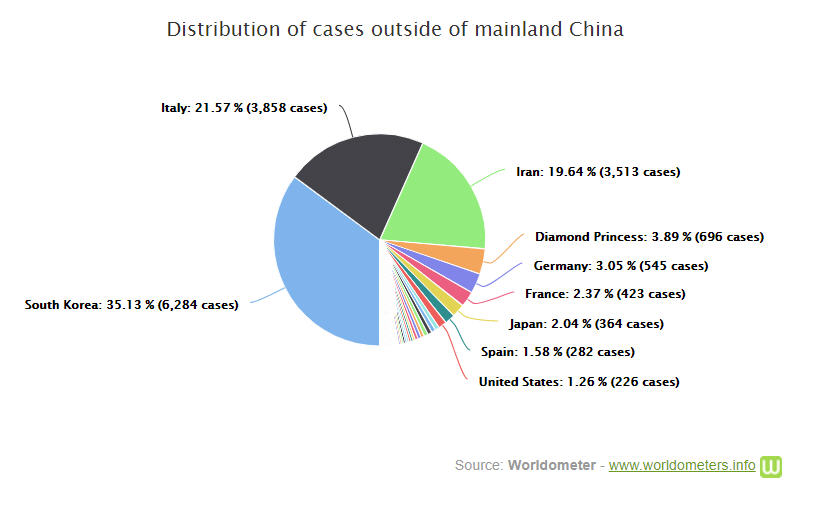 - Hàn Quốc tiếp tục có thêm một ngày tăng vọt với tổng số là 6.284 ca nhiễm (so với 5.766 người sáng qua) và 40 người tử vong (so với 35 người sáng qua). Iran cũng đại nhảy vọt lên 3.513 ca nhiễm (so với 2.922 ca sáng qua) và 108 người tử vong (so với 92 ca sáng qua). Ý tăng lên 3.858 ca nhiễm (so với 3.089 ca sáng qua) và 148 người chết (so với 107 người sáng qua). Nhật Bản có 364 ca nhiễm (so với 331 ca sáng qua) và 6 người chết (không thay đổi). Số liệu của Nhât Bản không tính 705 ca nhiễm và 6 người chết trên tàu du lịch quốc tế Diamond Princess chở 3.711 ngưới cập cảng Yokohama từ đầu tháng 2-2020. Đức có 545 ca nhiễm (so với 262 ca sáng qua). Singapore có 117 ca nhiễm (so với 112 ca sáng qua). Pháp có 423 ca nhiễm (so với 285 ca sáng qua) và 7 người chết (so với 4 ca sáng qua). Hong Kong có 105 ca nhiễm (so với 103 ca sáng qua) và 2 người chết (không thay đổi). Mỹ có 226 ca nhiễm (so với 158 ca sáng qua) và 12 người chết (so với 11 ca sáng qua). Tây Ban Nha có 282 ca nhiễm (so với 228 ca sáng qua) và 3 ca tử vong.