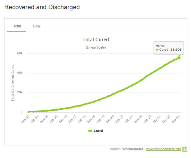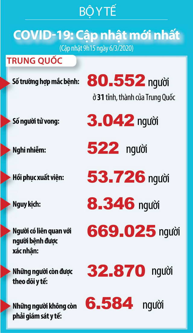 - Tới sáng ngày 6-3-2020, có 55.625 người nhiễm nCoV COVID-19 đã được chữa khỏi (chiếm 56,51% so với tổng người nhiễm; tỷ lệ này là 56,22% hồi sáng qua). Việt Nam đã chữa khỏi và cho xuất viện tổng cộng 16 người trong tổng số 16 người nhiễm.