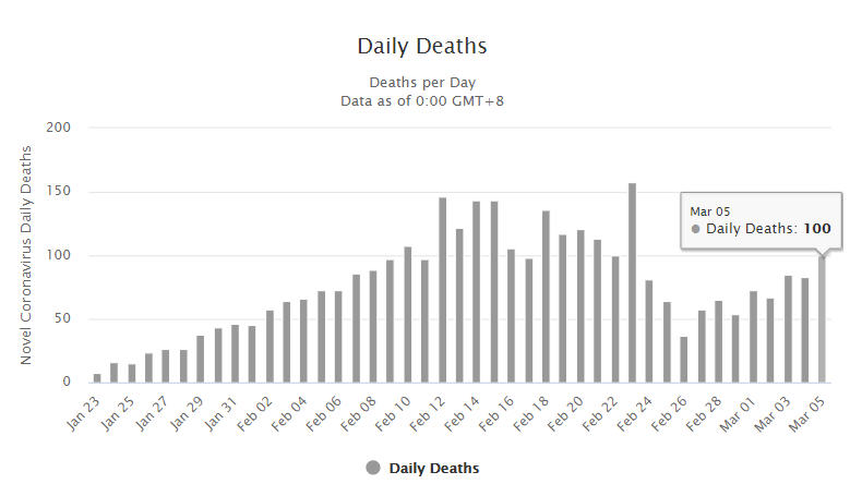 Ngày 23-2 là ngày có số lượng người tử vong cao nhất (158 người) kể từ khi phát hiện ca tử vong đầu tiên ngày 9-1-2020. Ngày 4-3 có 83 người chết, ngày 3-3 có 85 người chết, ngày 2-3 có 67 người chết, ngày 1-3 (74 người chết), ngày 29-2 (54 người chết), ngày 28-2 (65 người chết), 27-2 (58 người chết), ngày 26-2 có 37 người chết, ngày 25-2 có 64 người chết, ngày 24-2 có 81 người chết, ngày 23-2 có 158 người chết, ngày 22-2 có 100 người chết, ngày 21-2 có 113 người chết, ngày 20-2 có 121 người chết, ngày 19-2 có 117 người chết, ngày 18-2 có 136 người chết, ngày 17-2 có 98 người chết, ngày 16-2 có 106 người chết, ngày 15-2 có 143 người chết, ngày 14-2 có 143 người chết, ngày 13-2 có 122 người chết, ngày 11-2 có 97 người chết, ngày 10-2 có 108 người chết, ngày 9-2 có 97 người chết, ngày 8-2 có 89 người chết, ngày 7-2 có 86 người chết, hai ngày 6 và 5-2 có 73 người chết /ngày, ngày 4-2 có 66 người, ngày 3-2 có 64 người chết, ngày 2-2 có 58 người chết, ngày 1-2 có 45 người chết và ngày 31-1 có 46 người chết. Tỷ lệ người tử vong so với số nhiễm trong nhiều ngày gần đây vẫn tiếp tục tăng, dù nhẹ (sáng 5-3-2020 là 3,44%, so với 3,43% của hôm trước).