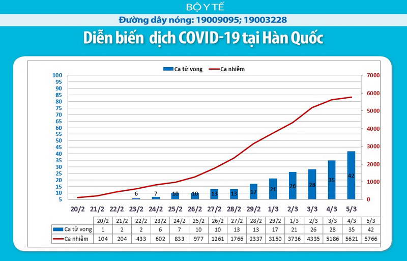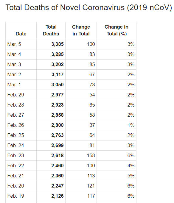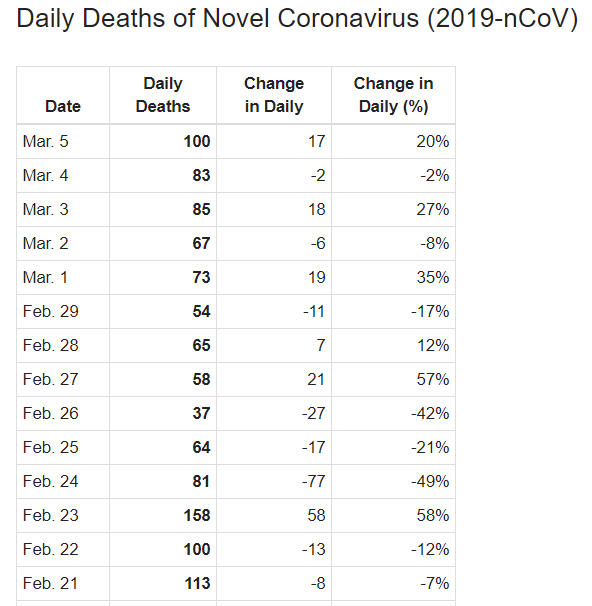 - Ngày 5-3-2020, số người mới tử vong vì virus nCoV COVID-19 đã trở lại 3 chữ số sau nhiều ngày ở dưới mốc này, có 100 người chết (so với 83 người của ngày 4-3). Trước đó, ngày 3-3 có 85 người chết; ngày 2-3 (67 người chết); ngày 1-3 (74 người chết); ngày 29-2 (54 người chết); ngày 28-2 (65 người chết); ngày 27-2 (58 người chết); ngày 26-2 (37 người chết); ngày 25-2 (64 người chết); ngày 24-2 (81 người chết); ngày 23-2 (158 người chết); ngày 22-2 (100 người chết); ngày 21-2 (113 người chết); ngày 20-1 (121 người chết); ngày 19-2 (117 người chết); ngày 18-2 (136 người chết); ngày 17-2 (98 người chết); ngày 16-2 (106 người chết); ngày 15-2 (143 người chết); ngày 14-2 (143 người chết); ngày 13-2 (122 người chết) và ngày 12-2 (146 người chết). Tốc độ tăng của số tử vong có xu hướng tiếp tục giảm trong nhiều ngày gần đây: ngày 12-2 tăng 13%, ngày 13-2 tăng 10%, ngày 14-2 tăng 10%, ngày 15-2 tăng 9%, ngày 16-2 tăng 6%, ngày 17-2 tăng 6%, ngày 18-2 tăng 7%, ngày 19-2 tăng 6%, ngày 20-2 tăng 6%, ngày 21-2 tăng 5%, ngày 22-2 tăng 4%, ngày 23-2 tăng 6%, ngày 24-2 tăng 3%, ngày 25-2 tăng 2%, ngày 26-2 tăng 1%, ngày 27-2 tăng 2%, ngày 28-2 tăng 2%, ngày 29-2 tăng 2%, ngày 1-3 tăng 2%, ngày 2-3 tăng 2%, ngày 3-3 tăng 3%, ngày 4-3 tăng 3%, và ngày 5-3 tăng 3%).