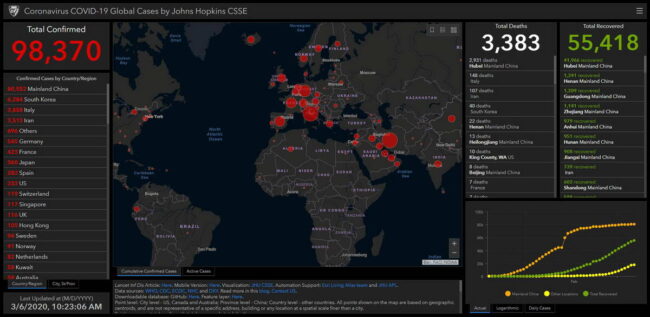 + Trang thông tin cập nhật về dịch Coronavirus COVID-19 Global Cases Johns Hopkins CESE của trường Đại học Y Johns Hopkins, một trường có tiếng ở Mỹ, tính tới sáng 6-3-2020 (theo giờ VN), ghi nhận: có 98.370 trường hợp nhiễm virus được xác nhận trên thế giới (so với 95.441 trường hợp ngày hôm qua), trong đó có 80.552 ca ở đại lục Trung Quốc (so với 80.409 ca ngày hôm qua). Có 3.383 người tử vong (so với 3.285 người hồi sáng qua). Và có 55.418 người bệnh đã được điều trị hồi phục (so với 53.255 người ngày hôm qua), trong đó có 41.966 người ở tỉnh Hubei tâm dịch. Trang này ghi nhận có 16 ca được chữa khỏi ở Việt Nam (ngày 25-2, Việt Nam công bố đã chữa khỏi 16 người trong tổng số 16 ca nhiễm).