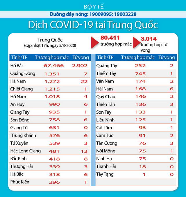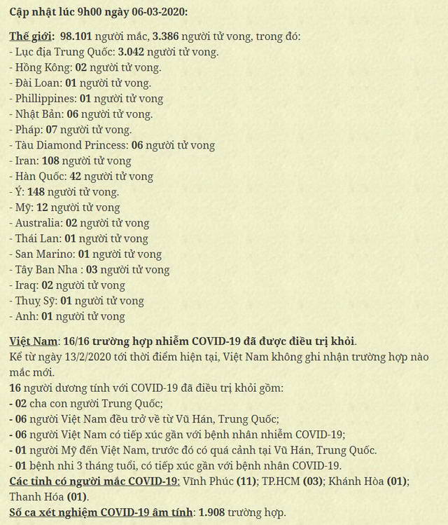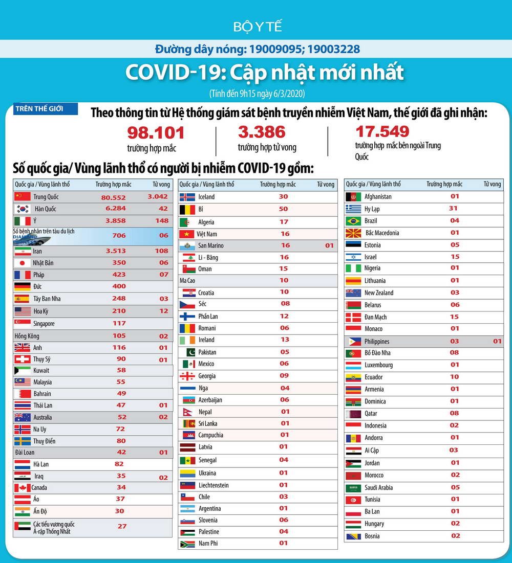 + Số liệu của Bộ Y tế Việt Nam cập nhật lúc 9g00 ngày 6-3-2020 cho biết cả thế giới có 98.101 người nhiễm virus nCoV COVID-19 (so với 95.379 người vào ngày hôm qua). Có 3.386 người chết, trong đó 3.042 người ở đại lục Trung Quốc.
