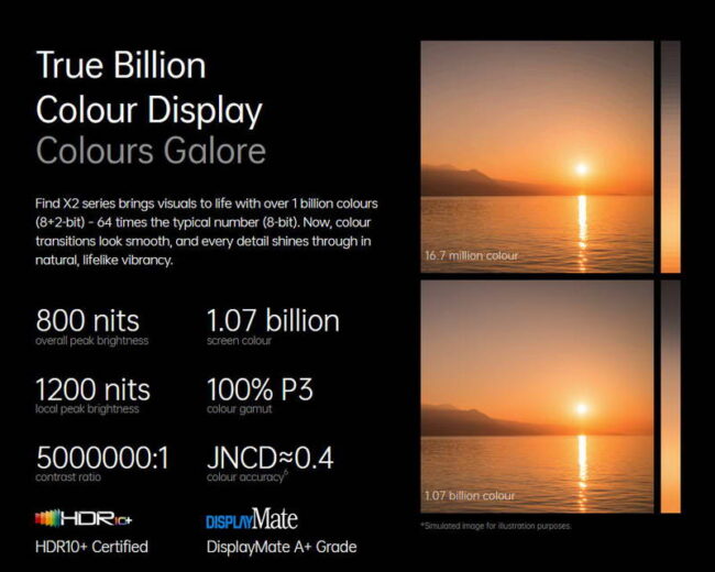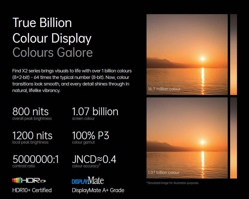 Mỗi sản phẩm Find X2 series đều được cân chỉnh màu một cách chuyên nghiệp sẵn tại nhà máy trước khi xuất xưởng, tạo nên dải màu sinh động, chính xác và có thể so sánh được với các màn hình chuyên dụng. Dải màu đạt 100% P3 và độ chính xác màu đạt chuẩn JNCD=0.4, Chất lượng màn hình của Find X2 series nhận được chứng nhận DisplayMate A+ Grade và đạt được 12 kỷ lục về màn hình smartphone từ DisplayMate, đơn vị thứ ba chuyên thử nghiệm màn hình. Đây được xem là một trong những màn hình smartphone đẹp nhất hiện nay.