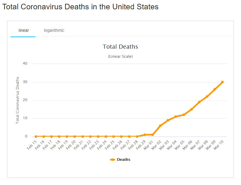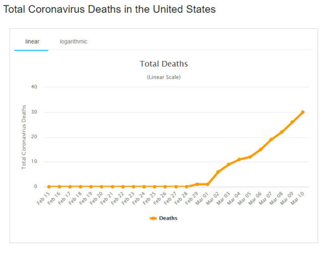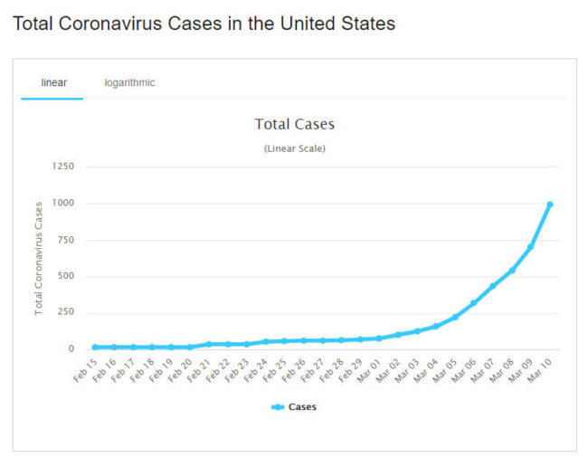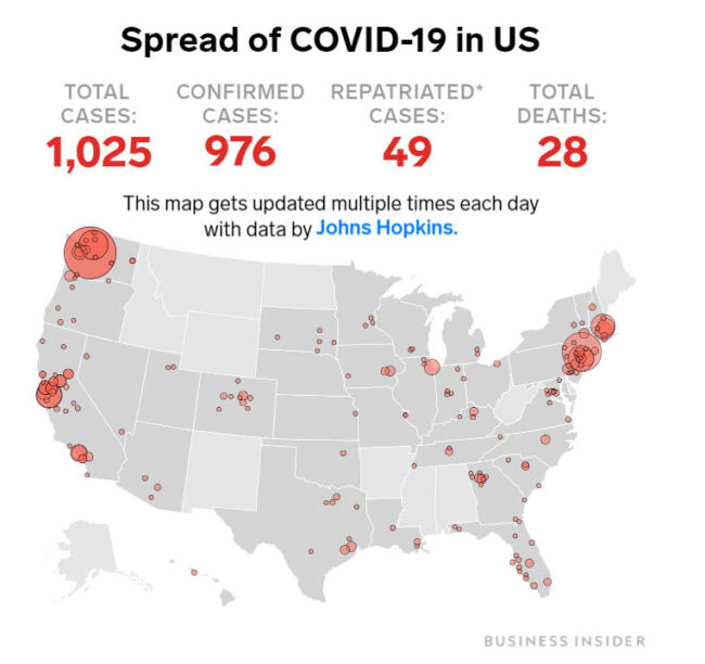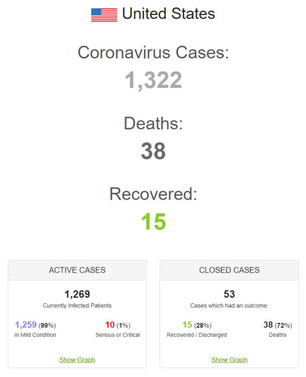 Mỹ trong ngày 11-3 có thêm 8 ca tử vong, tổng số là 38 người chết (30 người ở bang Washington, 2 ở Florida, 4 ở California, 1 ở South Dakota, 1 ở New Jersey). Có thêm 306 ca nhiễm mới (so với mức tăng 271 người hôm trước), tổng cộng là 1.300 người nhiễm tại 38 tiểu bang và DC từ Bờ Tây sang Bờ Đông. Bang đông nhất là Washington, kế đó là California. Trong đó có 46 người từ du thuyền quốc tế Diamond Princess cập cảng Nhật Bản và 3 người từ tâm dịch Wuhan – Trung Quốc trở về.