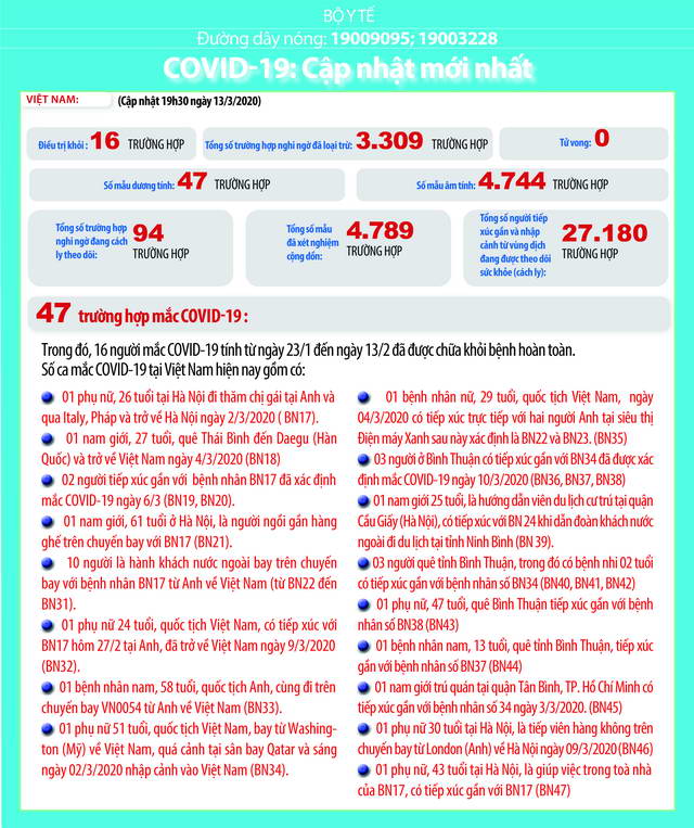 47 trường hợp nhiễm COVID-19 ở Việt Nam (theo dữ liệu của Bộ Y tế tối 13-3-2020)