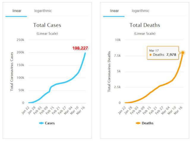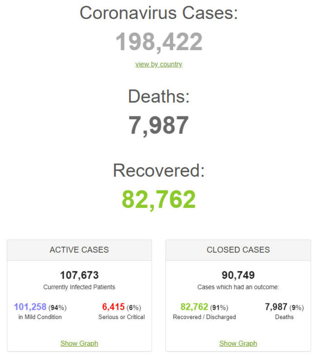 + Theo số liệu của trang Worldometer ngày 18-3-2020, cả thế giới đã có 198.422 người nhiễm virus (tăng từ 182.603 người sáng qua), trong đó có 6.415 người (so với 6.163 người hôm qua) trong tình trạng nặng hay nguy kịch, chiếm 6% trong tổng số đang nhiễm. Riêng ở đại lục Trung Quốc có 80.894 người nhiễm (tăng từ 80.881 người sáng qua). Có 7.987 người chết (tăng từ 7.171 người hồi sáng qua) tại 56 nước và vùng lãnh thổ, trong đó 3.237 người ở đại lục Trung Quốc (tăng so với 3.226 người hồi sáng qua) và 4.750 người ở thế giới bên ngoài, trong đó có số người chết từ 10 người trở lên là Anh (71), Bỉ (10), Đức (26), Hà Lan (43), Hàn Quốc (84), Mỹ (109), Nhật Bản (29), Iran (988), Iraq (11), Pháp (175), Philippines (12), San Marino (11), Tây Ban Nha (533), Thụy Sĩ (27), Ý (2.503).