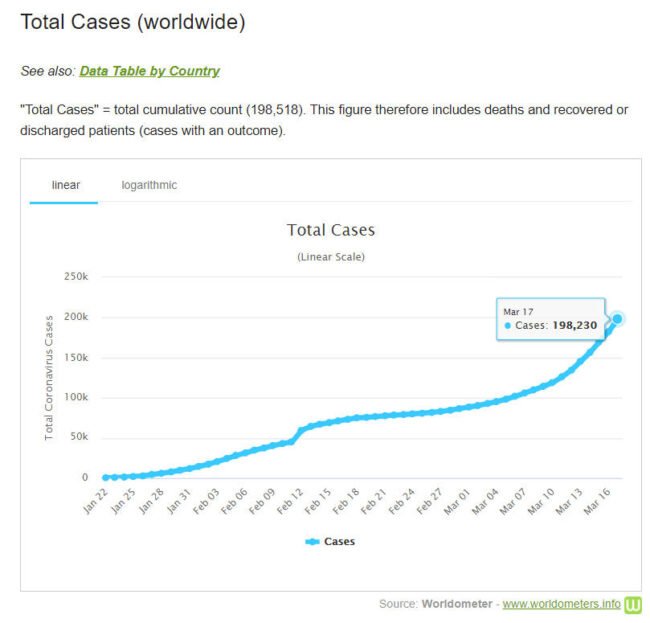 Thế giới trải qua một ngày 17-3-2020 với số người nhiễm và chết trong một ngày cao kỷ lục, có thêm 15.740 ca nhiễm mới (hôm trước tăng 12.896 ca) và thêm 817 người chết (hôm trước tăng 641 ca). Hôm nay đã có 165 nước và vùng lãnh thổ có người nhiễm wuhan novel coronavirus (SARS-CoV-2) với 198.422 người nhiễm (107.672 người đang điều trị – active cases), có 117.336 người ở 164 nước và vùng lãnh thổ bên ngoài đại lục Trung Quốc; 7.978 người chết (chiếm 4,02% so với tổng nhiễm); và 82.762 người đã được chữa khỏi (chiếm 41,71% so với tổng nhiễm). Số người nhiễm và tử vong bên ngoài đại lục Trung Quốc đã nhiều hơn ở đại lục (59,23% so với 40,77% về số người nhiễm).