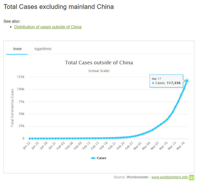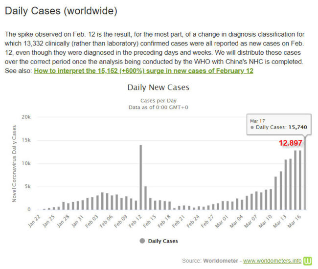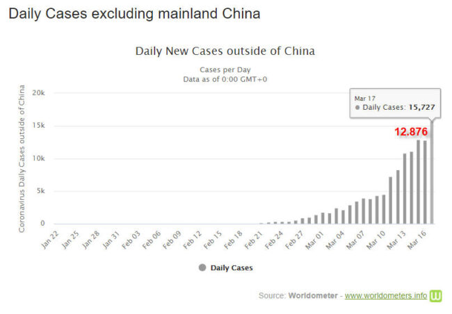 • Ở đại lục Trung Quốc, theo báo cáo, trong ngày 17-3-2020, số nhiễm mới tăng 13 người (so 21 người hôm trước) và số tử vong mới tăng 11 người (so với 13 người ngày hôm trước). Nhưng ở thế giới bên ngoài Trung Quốc, novel coronavirus đang ngày càng thêm hung hăng và lan rộng hơn. Ở bên ngoài đại lục Trung Quốc trong ngày 17-3 có thêm 15.727 ca nhiễm mới (so với 12.876 ca ngày hôm trước). Liên tiếp từ ngày 23-2-2020 mỗi ngày đều có thêm nước mới xuất hiện người nhiễm SARS-CoV-2 (tên chính thức của novel coronavirus). Ngày 13-3 có thêm 18 nước, ngày 14-3 tăng thêm 7 nước, ngày 15-3 tăng thêm 5 nước, ngày 16-3 thêm 5 nước, ngày 17-3 thêm 3 nước. Hiện có 165 nước và vùng lãnh thổ có người mắc bệnh COVID-19 (so với 157 sáng qua) – thế giới có 195 quốc gia được Liên Hiệp Quốc công nhận.