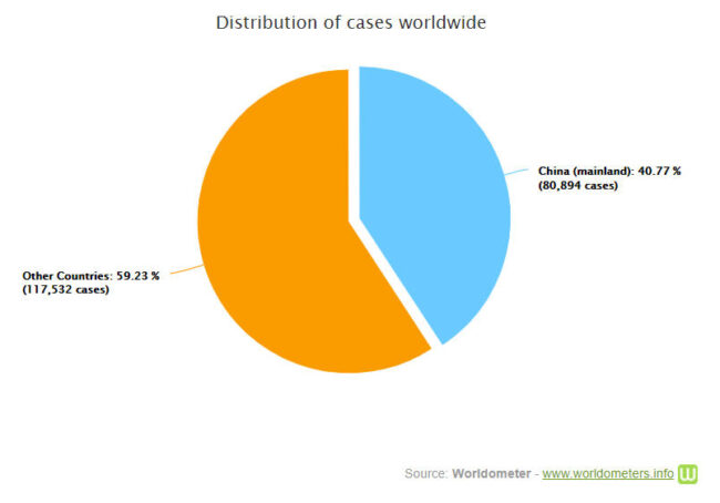 The coronavirus COVID-19 is affecting 165 countries and territories around the world and 1 international conveyance (the Diamond Princess cruise ship harbored in Yokohama, Japan). The day is reset after midnight GMT+0. The “New” columns for China display the previous day changes (as China reports after the day is over). For all other countries, the “New” columns display the changes for the current day while still in progress.