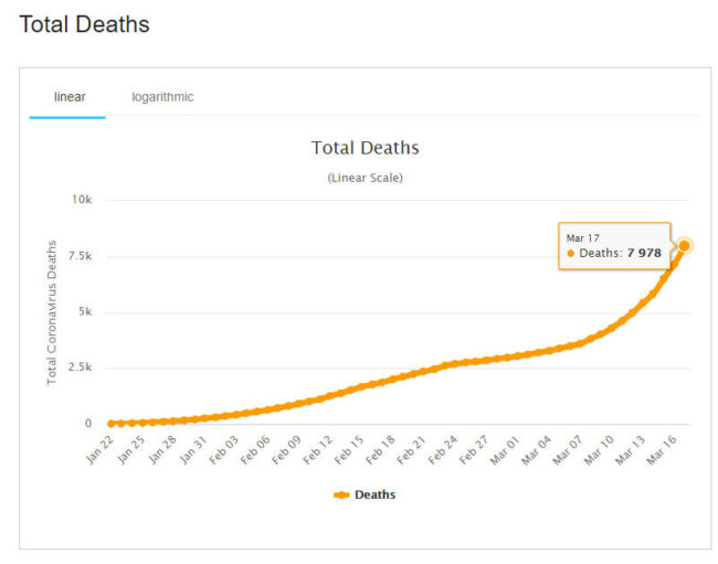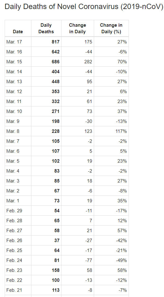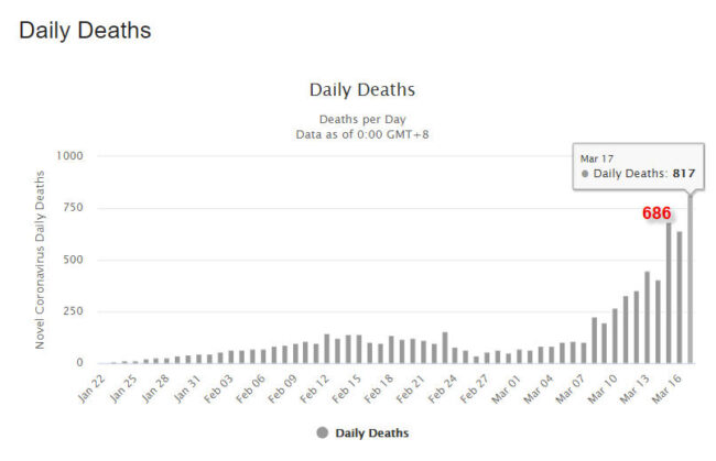 Ngày 17-3 là ngày có số lượng người tử vong cao nhất (817 người) kể từ khi phát hiện ca tử vong đầu tiên ngày 9-1-2020. Ngày 16-3 có 641 người chết, ngày 15-3 (686 người chết), ngày 14-3 (404 người chết), ngày 13-3 (448 người chết), ngày 12-3 (354 người chết), ngày 11-3 (332 người chết), ngày 10-3 (271 người chết), ngày 9-3 (198 người chết), ngày 8-3 (228 người chết), ngày 7-3 (có 105 người chết). Tỷ lệ người tử vong so với số nhiễm trong nhiều ngày gần đây vẫn tiếp tục dao động khi tăng lúc giảm, dù nhẹ (sáng 18-3-2020 là 4,02%, so với 3,92% của hôm trước).