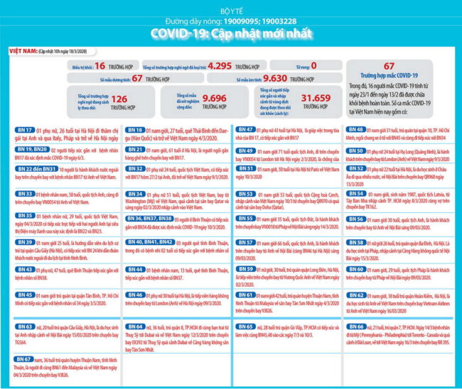 – BN66: nữ, 21 tuổi, trú quận 7, TP.HCM. Ngày 14-3 bệnh nhân đi từ Mỹ (Pennsylvania – Philadenphia) tới Toronto – Canada và quá cảnh ở Đài Loan, về tới Việt Nam ngày 16-/3 trên chuyến bay BR 395.
