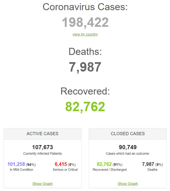 + Theo số liệu của trang Worldometer ngày 18-3-2020, cả thế giới đã có 198.422 người nhiễm virus (tăng từ 182.603 người sáng qua), trong đó có 6.415 người (so với 6.163 người hôm qua) trong tình trạng nặng hay nguy kịch, chiếm 6% trong tổng số đang nhiễm. Riêng ở đại lục Trung Quốc có 80.894 người nhiễm (tăng từ 80.881 người sáng qua). Có 7.987 người chết (tăng từ 7.171 người hồi sáng qua) tại 56 nước và vùng lãnh thổ, trong đó 3.237 người ở đại lục Trung Quốc (tăng so với 3.226 người hồi sáng qua) và 4.750 người ở thế giới bên ngoài, trong đó có số người chết từ 10 người trở lên là Anh (71), Bỉ (10), Đức (26), Hà Lan (43), Hàn Quốc (84), Mỹ (109), Nhật Bản (29), Iran (988), Iraq (11), Pháp (175), Philippines (12), San Marino (11), Tây Ban Nha (533), Thụy Sĩ (27), Ý (2.503).