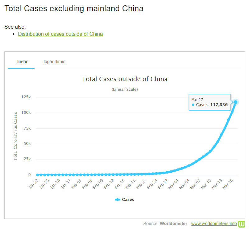 • Ở đại lục Trung Quốc, theo báo cáo, trong ngày 17-3-2020, số nhiễm mới tăng 13 người (so 21 người hôm trước) và số tử vong mới tăng 11 người (so với 13 người ngày hôm trước). Nhưng ở thế giới bên ngoài Trung Quốc, novel coronavirus đang ngày càng thêm hung hăng và lan rộng hơn. Ở bên ngoài đại lục Trung Quốc trong ngày 17-3 có thêm 15.727 ca nhiễm mới (so với 12.876 ca ngày hôm trước). Liên tiếp từ ngày 23-2-2020 mỗi ngày đều có thêm nước mới xuất hiện người nhiễm SARS-CoV-2 (tên chính thức của novel coronavirus). Ngày 13-3 có thêm 18 nước, ngày 14-3 tăng thêm 7 nước, ngày 15-3 tăng thêm 5 nước, ngày 16-3 thêm 5 nước, ngày 17-3 thêm 3 nước. Hiện có 165 nước và vùng lãnh thổ có người mắc bệnh COVID-19 (so với 157 sáng qua) – thế giới có 195 quốc gia được Liên Hiệp Quốc công nhận.