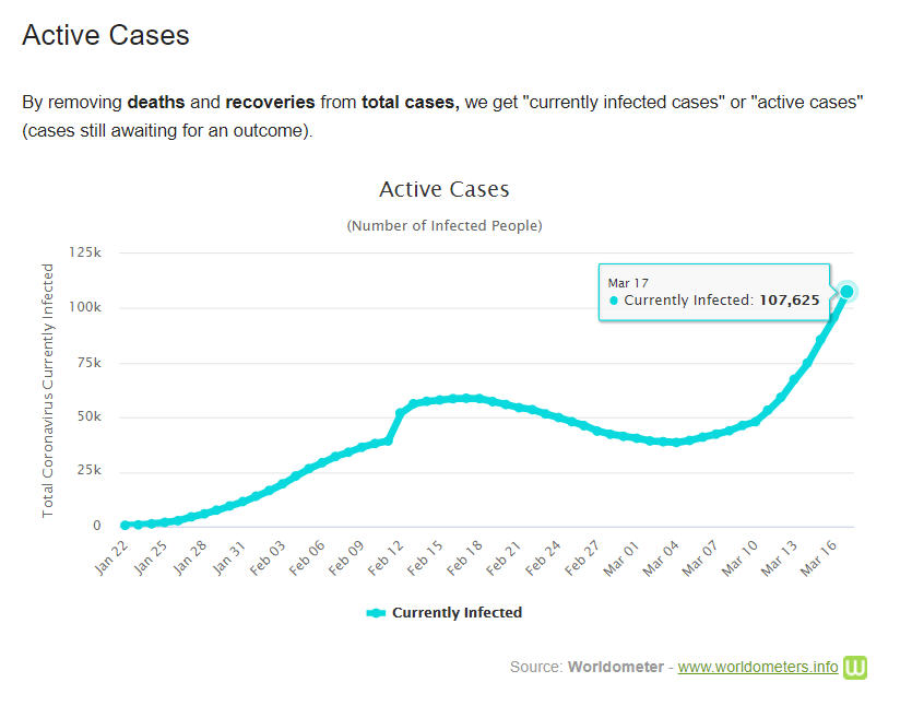 Có 817 người chết trong ngày 17-3 (so với 641 người ngày hôm trước). Số người được chữa khỏi COVID-19 hiện là 82.762 người (tăng từ 79.881 người vào sáng qua). Trừ đi số đã xác định (outcome) bao gồm tử vong, khỏi bệnh và xuất viện (tổng cộng 90.749 người), số người hiện đang nhiễm là 107.673 người (tăng từ 95.551 người sáng qua, tăng trở lại từ ngày 6-3).