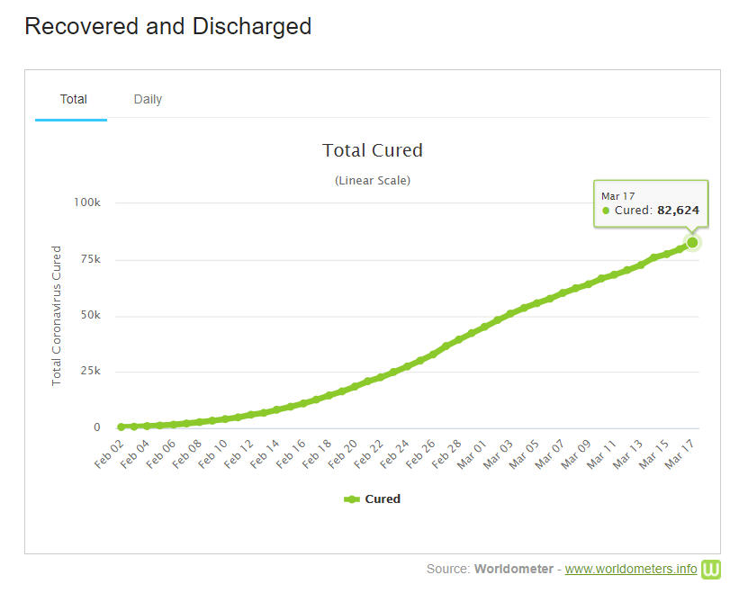 • Tới sáng ngày 18-3-2020, có 82.762 người nhiễm nCoV COVID-19 đã được chữa khỏi (chiếm 41,71% so với tổng người nhiễm; tỷ lệ này là 43,74% hồi sáng qua, mấy ngày gần đây giảm dần do số người nhiễm mới ở bên ngoài đại lục tăng quá nhanh).