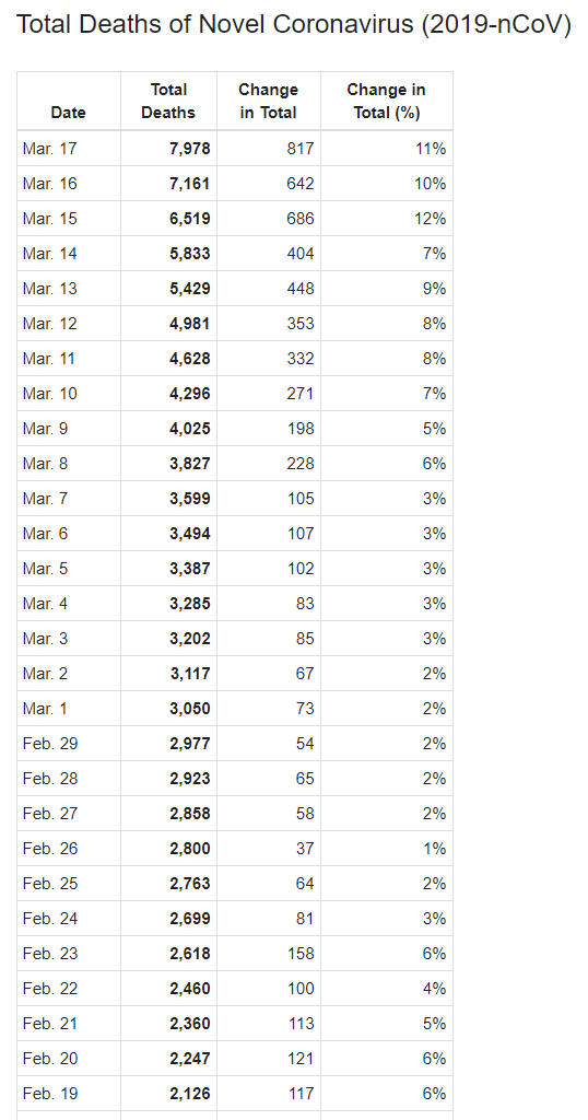 Ngày 17-3 là ngày có số lượng người tử vong cao nhất (817 người) kể từ khi phát hiện ca tử vong đầu tiên ngày 9-1-2020. Ngày 16-3 có 641 người chết, ngày 15-3 (686 người chết), ngày 14-3 (404 người chết), ngày 13-3 (448 người chết), ngày 12-3 (354 người chết), ngày 11-3 (332 người chết), ngày 10-3 (271 người chết), ngày 9-3 (198 người chết), ngày 8-3 (228 người chết), ngày 7-3 (có 105 người chết). Tỷ lệ người tử vong so với số nhiễm trong nhiều ngày gần đây vẫn tiếp tục dao động khi tăng lúc giảm, dù nhẹ (sáng 18-3-2020 là 4,02%, so với 3,92% của hôm trước).