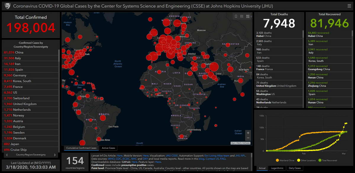 + Trang thông tin cập nhật về dịch Coronavirus COVID-19 Global Cases Johns Hopkins CESE của trường Đại học Y Johns Hopkins, một trường có tiếng ở Mỹ, tính tới sáng 18-3-2020 (theo giờ VN), ghi nhận: có 198.004 trường hợp nhiễm virus được xác nhận trên thế giới (so với 182.405 trường hợp ngày hôm qua), trong đó có 81.074 ca ở đại lục Trung Quốc (so với 81.049 ca ngày hôm qua). Có 7.948 người tử vong (so với 7.154 người hồi sáng qua). Và có 81.946 người bệnh đã được điều trị hồi phục (so với 79.433 người ngày hôm qua), trong đó có 56.883 người ở tỉnh Hubei tâm dịch. Trang này ghi nhận có 16 ca được chữa khỏi ở Việt Nam (ngày 25-2, Việt Nam công bố đã chữa khỏi 16 người trong tổng số 16 người nhiễm được ghi nhận vào lúc đó).