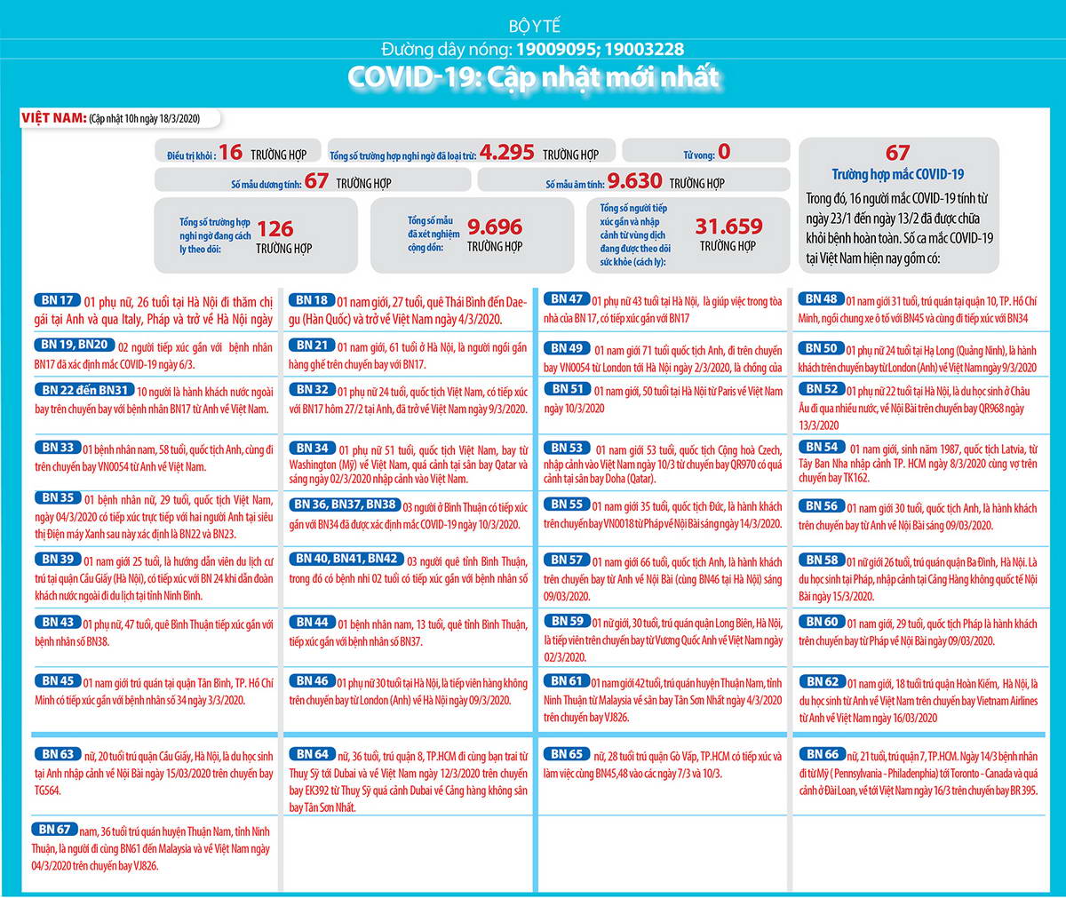 – BN63: nữ, 20 tuổi trú quận Cầu Giấy, Hà Nội, là du học sinh tại Anh nhập cảnh về Nội Bài ngày 15-3-2020 trên chuyến bay TG564.