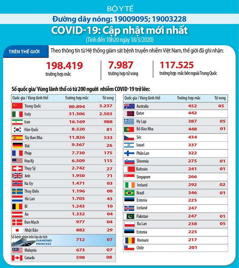 + Số liệu của Bộ Y tế Việt Nam cập nhật lúc 10g15 ngày 18-3-2020 cho biết cả thế giới có 198.419 người nhiễm virus nCoV COVID-19 (so với 182.538 người vào ngày hôm qua), trong đó đại lục Trung Quốc có 80.894 người. Có 7.987 người chết, trong đó 3.237 người ở đại lục Trung Quốc.