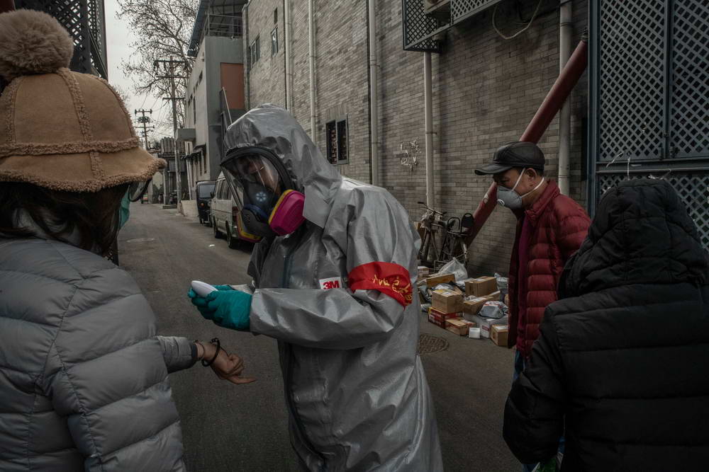 Nhân viên khu dân cưu kiểm tra căn cước và thân nhiệt người đi lại tại thủ đô Bắc Kinh ngày 18-3-2020. (Ảnh: Gilles Sabrié for The New York Times/ Internet. Thanks)