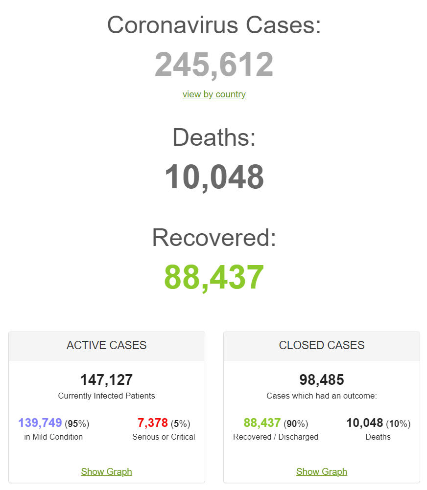 Nếu so với tổng số nhiễm cho tới ngày 20-3-2020 (245.612 người), tỷ lệ chữa khỏi (88.427 người) ở mức 36,00%% và tỷ lệ tử vong (10.048 người) ở mức 4,09%.