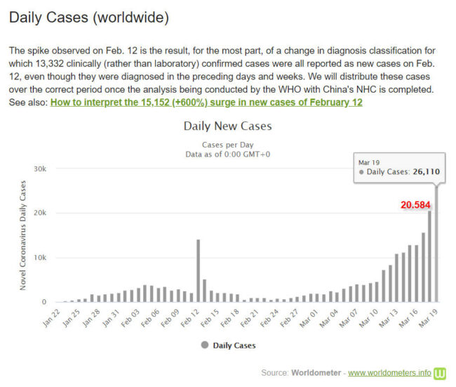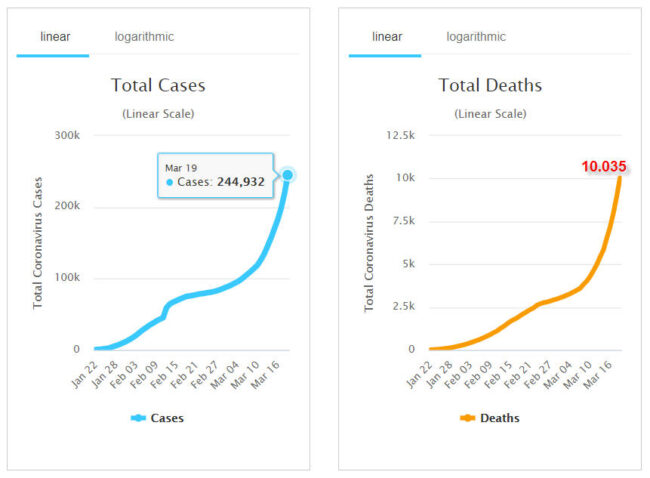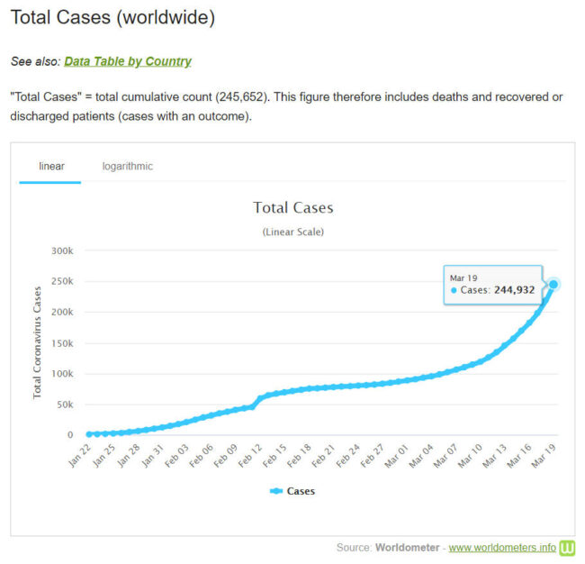 Thế giới trải qua một ngày 19-3-2020 với số người nhiễm và chết trong một ngày cao kỷ lục, có thêm 26.110 ca nhiễm mới (hôm trước tăng 20.575 ca) và thêm 1.084 người chết (hôm trước tăng 973 ca). Tốc độ tăng ớn lạnh trong mấy ngày nay. Chiều 18-3, số người nhiễm vượt mốc 200.000 và người chết vượt mốc 8.000. Sáng 20-3, thế giới đã có 179 nước và vùng lãnh thổ có người nhiễm novel coronavirus (SARS-CoV-2) với 245.612 người nhiễm (147.127 người đang điều trị – active cases), có 164.645 người ở 178 nước và vùng lãnh thổ bên ngoài đại lục Trung Quốc. Chỉ trong 2 ngày, thế giới liên tục vượt mốc 8.000, rồi 9.000 và 10.000 người chết. Sáng 20-3 ghi nhận có 10.048 người chết (chiếm 4,09% so với tổng nhiễm); và 88.437 người đã được chữa khỏi (chiếm 36,00% so với tổng nhiễm). Số người nhiễm và tử vong bên ngoài đại lục Trung Quốc đang ngày càng nhiều hơn ở đại lục (67,04% so với 32,96% về số người nhiễm).