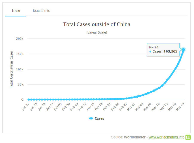 - Ở đại lục Trung Quốc, theo báo cáo, trong ngày 19-3-2020, số nhiễm mới tăng 39 người (so 34 người hôm trước) và số tử vong mới tăng 3 người (so với 8 người ngày hôm trước). Nhưng ở thế giới bên ngoài Trung Quốc, novel coronavirus đang ngày càng thêm hung hăng và lan rộng hơn. Ở bên ngoài đại lục Trung Quốc trong ngày 19-3 có thêm 26.071 ca nhiễm mới (so với 20.550 ca ngày hôm trước). Liên tiếp từ ngày 23-2-2020 mỗi ngày đều có thêm nước mới xuất hiện người nhiễm SARS-CoV-2 (tên chính thức của novel coronavirus). Ngày 13-3 có thêm 18 nước, ngày 14-3 tăng thêm 7 nước, ngày 15-3 tăng thêm 5 nước, ngày 16-3 thêm 5 nước, ngày 17-3 thêm 3 nước, ngày 18-3 thêm 8 nước và lãnh thổ, ngày 19-3 thêm 6 nước. Hiện có 179 nước và vùng lãnh thổ có người mắc bệnh COVID-19 (so với 173 sáng qua) – thế giới có 195 quốc gia được Liên Hiệp Quốc công nhận.
