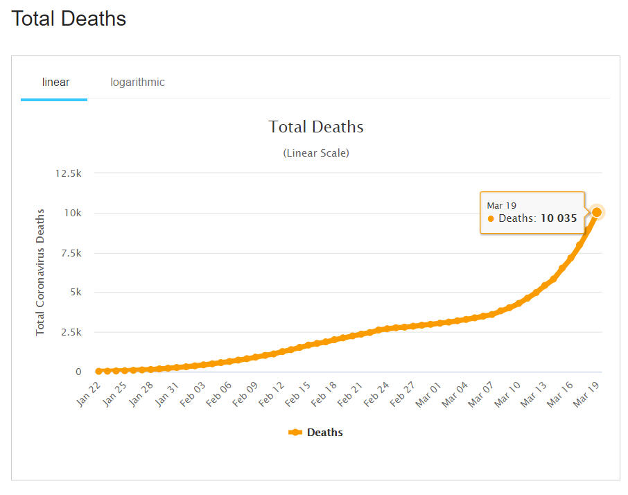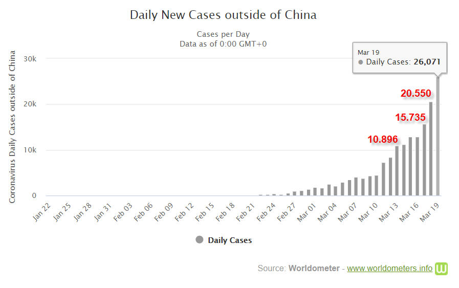 - Ngày 19-3-2020, số người mới tử vong vì virus nCoV COVID-19 là 1.084 người (so với 973 người của ngày 18-3). Trong khi đại lục Trung Quốc chỉ có thêm 3 người chết (so với 8 người hôm trước), các nước khác tăng tới 1.081 người chết (so với mức tăng 965 người hôm trước). Từ ngày 24-2 tới 4-3 có mức tăng tử vong hàng ngày dưới 100 ca.