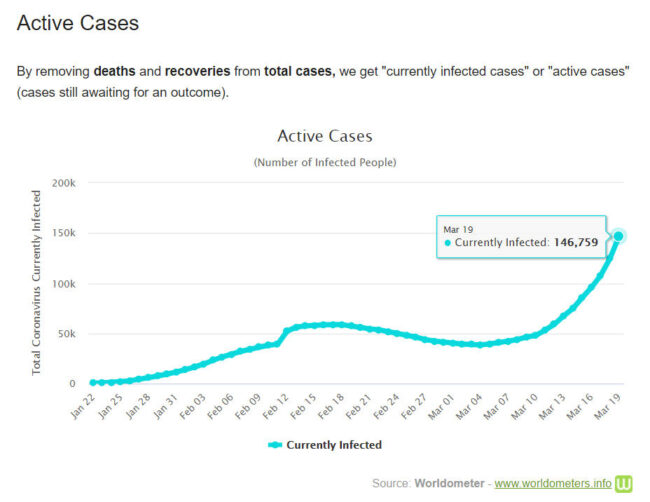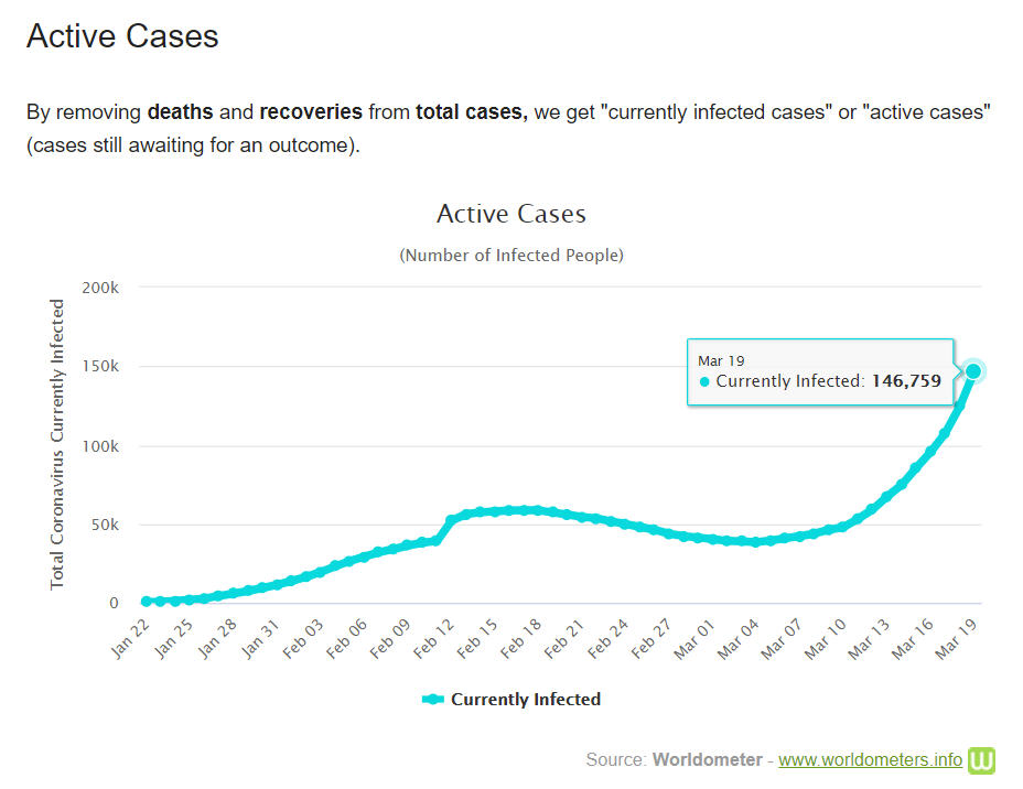 Có 1.084 người chết trong ngày 19-3 (so với 973 người ngày hôm trước). Số người được chữa khỏi COVID-19 hiện là 88.437 người (tăng từ 85.673 người vào sáng hôm trước). Trừ đi số đã xác định (outcome) bao gồm tử vong, khỏi bệnh và xuất viện (tổng cộng 98.485 người), số người hiện đang nhiễm là 147.127 người (tăng từ 124.433 người sáng hôm trước, tăng trở lại từ ngày 6-3).