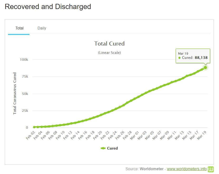 - Tới sáng ngày 20-3-2020, có 88.427 người nhiễm nCoV COVID-19 đã được chữa khỏi (chiếm 36,00% so với tổng người nhiễm; tỷ lệ này là 39,10% hồi sáng hôm trước, mấy ngày gần đây giảm dần do số người nhiễm mới ở bên ngoài đại lục tăng quá nhanh).