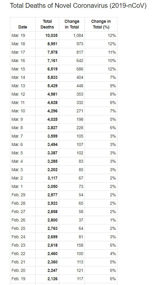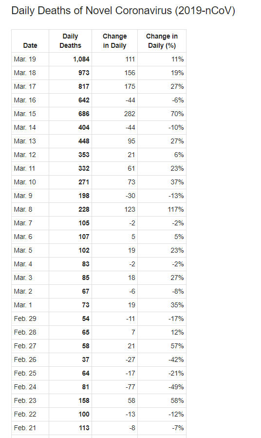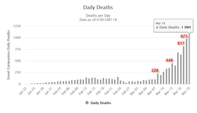 Ngày 19-3 là ngày có số lượng người tử vong cao nhất (1.084 người) kể từ khi phát hiện ca tử vong đầu tiên ngày 9-1-2020. Ngày 18-3 có 973 người chết, ngày 17-3 (817 người chết, ngày 16-3 (641 người chết), ngày 15-3 (686 người chết), ngày 14-3 (404 người chết), ngày 13-3 (448 người chết), ngày 12-3 (354 người chết), ngày 11-3 (332 người chết), ngày 10-3 (271 người chết), ngày 9-3 (198 người chết), ngày 8-3 (228 người chết), ngày 7-3 (có 105 người chết). Tỷ lệ người tử vong so với số nhiễm trong nhiều ngày gần đây vẫn tiếp tục dao động khi tăng lúc giảm, dù nhẹ (sáng 20-3-2020 là 4,09%, so với 4,09% của hôm trước).