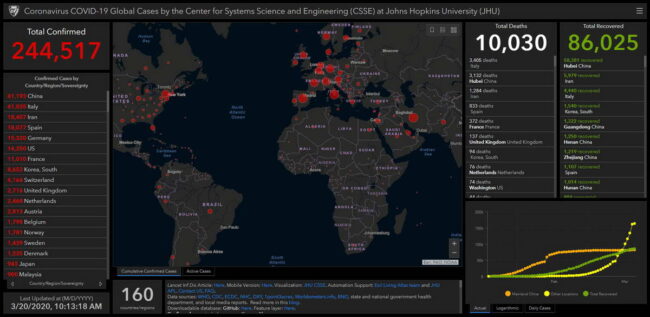 + Trang thông tin cập nhật về dịch Coronavirus COVID-19 Global Cases Johns Hopkins CESE của trường Đại học Y Johns Hopkins, một trường có tiếng ở Mỹ, tính tới sáng 20-3-2020 (theo giờ VN), ghi nhận: có 244.517 trường hợp nhiễm virus được xác nhận trên thế giới (so với 218.177 trường hợp ngày hôm qua), trong đó có 81.193 ca ở đại lục Trung Quốc (so với 81.137 ca ngày hôm qua). Có 10.030 người tử vong (so với 8.805 người hồi sáng qua). Và có 86.025 người bệnh đã được điều trị hồi phục (so với 84.112 người ngày hôm qua), trong đó có 58.381 người ở tỉnh Hubei tâm dịch. Trang này ghi nhận có 16 ca được chữa khỏi ở Việt Nam (ngày 25-2, Việt Nam công bố đã chữa khỏi 16 người trong tổng số 16 người nhiễm được ghi nhận vào lúc đó).