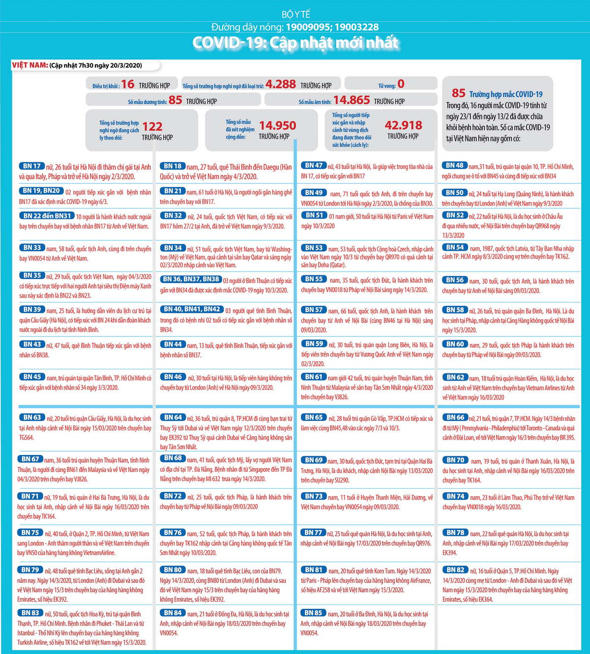Như vậy Việt Nam có 85 ca nhiễm virus nCoV COVID-19 (gồm 59 người Việt Nam, 2 người Trung Quốc, 1 người Mỹ gốc Việt, và 23 người nước ngoài khác). Giai đoạn 1 (từ 23-1 tới 5-3-2020) có 16 người nhiễm (tính từ ngày 23-1 đến ngày 13-2) đã được chữa khỏi bệnh hoàn toàn. Ca cuối cùng của giai đoạn 1 đã xuất viện ngày 23-2. Giai đoạn 2 (từ 6-3-2020 tới nay) hiện có 69 ca nhiễm đang được điều trị.
